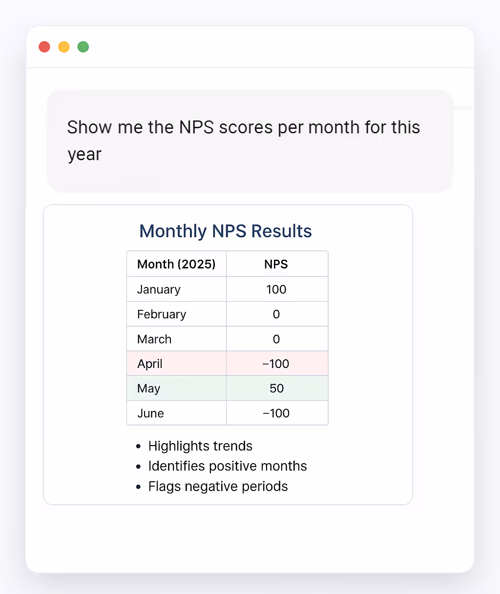 Obtain comprehensive insights into your data whether analyzing trends or NPS scores and effortlessly filter to retrieve the specific results you require.