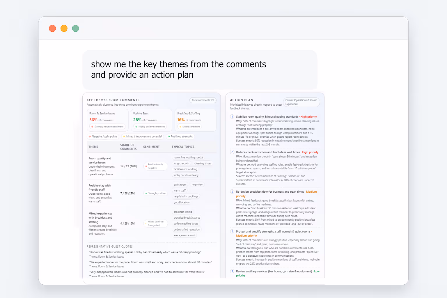 Stop drowning in lengthy customer responses. Artemis automatically extracts and summarizes the essential insights from your feedback, then delivers actionable recommendations to help you get the most out of it.